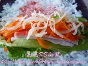 胡萝卜刨丝,过沸水烫熟(我妈不喜欢生萝卜);蟹肉棒切条也烫熟;火腿切条,生菜洗净沥干水。</li> <li>2