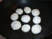 煎一两分钟后倒入面粉水(为了使包子的底部有一层酥脆的表皮),面粉水要加到包子的2/5处(太少了,怕包子不熟)撒上葱花和芝麻粒。</li> <li>9