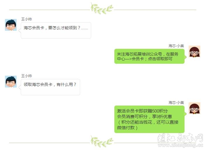 海芯微信会员来了 激活会员卡即获赠500积分 会员消费可积分,享9折优惠 积分还能当钱花 (例如:消费100元可得100积分) 抵现:500积分=5元 微会员功能: 1、带上手机,即可享受海芯会员服务; 2、随时随地查询会员积分; 3、了解海芯拓展培训会员最新优惠活动; 4、众多电子券,方便又实惠。