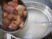 带骨的鸡块放进开水里焯去血水,然后放进锅里加入清水(熬粥的水量)和两片姜和一小匙米酒,合盖烧开。