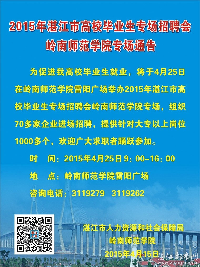 - [2015-04-17]【高校招聘】4月25日湛江市高校毕业生专场招聘会岭南师范学院专场通告