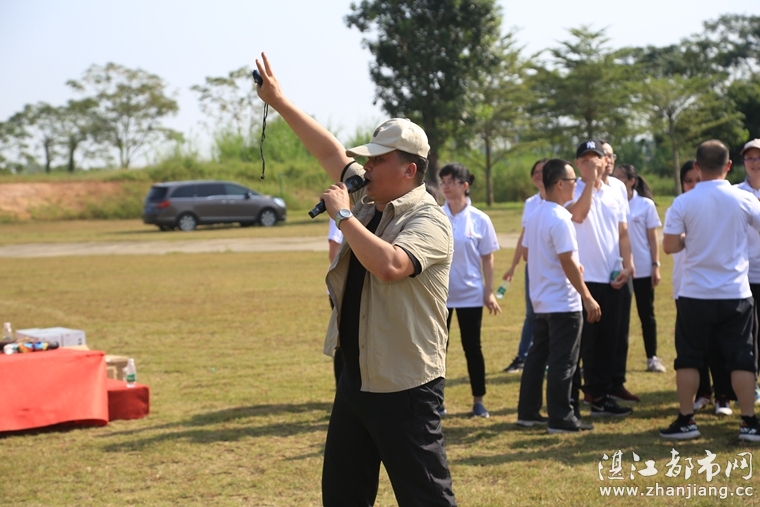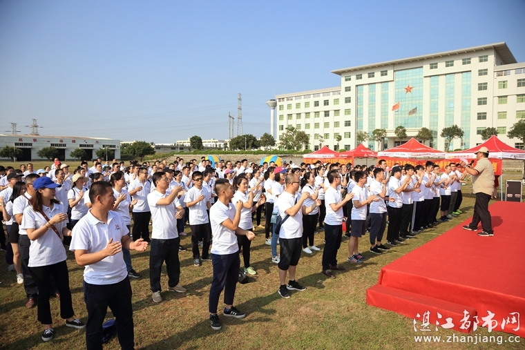 张葛峰主教练带领广发银行湛江分行员工进行趣味运动会比赛之前的热身。