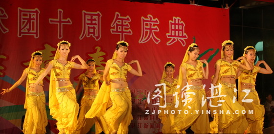 阅读(1195) 回复(0) 查看全文>> - [2011-09-22]紫荆十载 歌舞青春(一)碧海银沙网讯(图文/陈 莉 许德增 编辑/金 臻 小 雨)十年弹指间,芳华正伊始。8月6日晚,为庆祝建团10周年,湛江紫荆形体艺术团(樱子艺术培训基地)在霞山海滨公园开心广场举行“歌舞青春”庆典晚会。 热情的草裙舞、可爱的少儿爵士、带有异域风情的印度舞……晚会以歌舞等形式生动展现了该艺术团十年的艺术成果,呈现了一批由该艺术团自编、自导、自演的精品节目,如曾获得市委宣传部、市文化局嘉奖的舞蹈《绣娘》、《恒河之恋》,以及为了庆典晚会精心编排的舞蹈《傣家情》等。