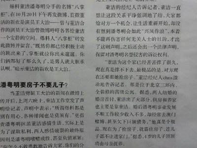“‘董洁为这个家已经苦苦撑了很久,现在真的撑不下去,最极品的是,对方现在还要跟她抢房子。’董洁经纪人***is激动的告诉记者。那是位于北京三环内、全装修的高级公寓。据悉,两人结婚的婚房首付,董洁出了大部分,供房和养家也要靠董洁。婚后潘粤明事业发展不顺工作较少收入不多,却经常去澳门赌博,甚至欠下了巨额债务,‘他真是个极品,现在为了抢房子,就霸住房子,连儿子都不让进家门。’据悉,4岁的儿子顶顶将由母亲抚养。”