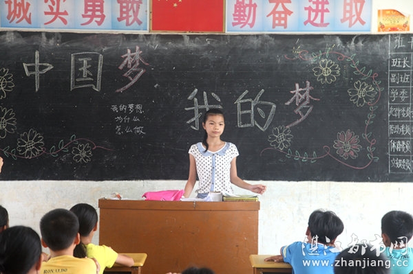今天是岭南师范学院红土情缘社会实践队来到海棠小学的第六天,一大早,各年级的班主任就在教室里准备主题班会的黑板报,五年级的黑板被写上了“中国梦,我的梦”六个大字,还特意画上花朵装饰。