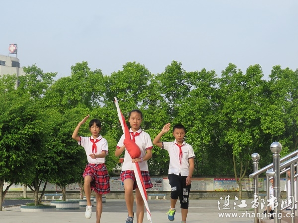出操音乐在校园中响起,全体实践队队员和全体学生迅速赶到操场有秩序地排好队。随着主持人宣布升旗仪式开始,嘈杂的操场立即安静下来,全体人员立正同时面向国旗。在阵阵激昂的乐声中,三名旗手穿着统一的服装,执旗手举着国旗走在前面,两名护旗手站在执旗手的后面,迈着整齐的步伐徐徐向升旗台走去。随着礼乐的停止,三名旗手在升旗台前立正,向右转,面向升旗台。一名旗手快速固定好国旗。《义勇军进行曲》的音乐刚响起,护旗手跨步把国旗展开,升旗手拉动绳子徐徐升旗,少先队员们也快速举起他们的右手向国旗敬礼,同时高唱国歌。和曦的阳光下,红领巾在随风飘扬,嘹亮的歌声在空中萦绕盘旋。