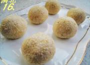 锅中放油、要多放点、待油温5-6成热时下入麻元生坯、用漏勺不停地搅动、这样炸出来的麻元才会受热均匀、成品漂亮且圆、油温不要高。