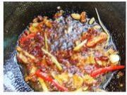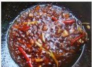 起锅放油,油热后,放入切好的葱白段、姜、蒜炒香,再放入郫县豆瓣,颜色翻红后,加入酱油、料酒、花椒粉、白糖、醋,迅速翻炒。