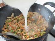 倒入虾和鱼泡后,再淋上两大勺酱油和适量的开水炒匀。