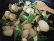 锅中留底油,烧热后加入蒜粒炒出香味。再将步骤二中加工过的原料倒入锅中。加入盐,生抽,少量料酒。翻炒均匀。