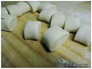 把面粉揉成均匀的长条,切大小合适的小块,压成小圆形。