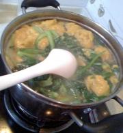 水烧开后就可以将糊糊放进去煮了,喜欢吃小疙瘩的就放小面团,喜欢吃大疙瘩的就放大面团,哈哈!注意哦,旁边还有一碗水,为了防面粘在汤勺上,每舀一勺就在水中刷一下。