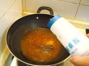 把在烤箱中用来接汤汁的烤盘取出,把汤汁倒入锅中。