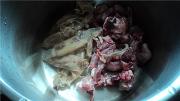 先把洗泡过的鸡骨与墨鱼干放入压力锅里。
