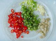 美人椒、杭椒分别洗净,去蒂,切成小圈;榨菜温水浸泡5分钟,攥干水分,切成碎。