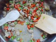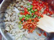 鸡胗炒至变色,加榨菜、辣椒圈、剁辣椒。