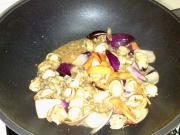 锅里放油放入胡萝卜和洋葱翻炒后放入扇贝肉。