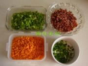 腊肉上锅蒸10分钟,放凉后切成肉末。青椒胡萝卜切成小丁,小葱切成末。