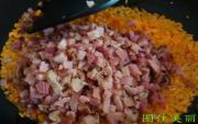 炒锅内放油,先放胡萝卜煸炒,再放腊肉,接着放入青椒丁翻炒几下。