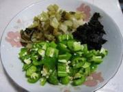 酸菜和青椒切丁。