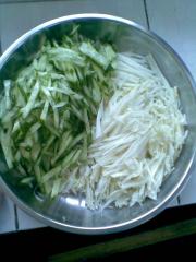 将黄瓜和白菜芯切丝。