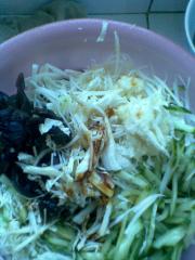 把木耳.黄瓜.白菜芯和大蒜放在盆中加入盐味精蚝油芥茉油,搅拌均匀就可以了。