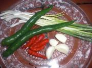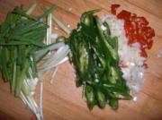 红辣椒、蒜分别剁碎,葱切寸段,青辣椒斜切成薄片(长短同葱段)。