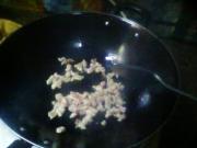 勺内留油少许,用葱姜末炝锅,下入肉丁煸炒。
