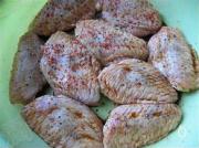 每个翅上面均匀撒上薄啊的盐和适量大蒜粉、小辣椒粉、黑胡椒粉、黑胡椒碎。(依据个人口味,爱吃辣可多放辣椒粉,爱吃黑胡椒味道可多放黑胡椒粉和碎。)