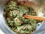 再倒入韭黄丁与炒好的馅料一起拌匀。