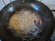 在不粘锅里炒粉丝,下生抽、几滴老抽、盐、用筷子搅拌均匀。