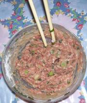 调馅 用红酒一小勺、盐一小勺、海鲜味酱油一勺、十三香粉一点、香葱末少许、用手抓一点面粉、打一个鸡蛋、顺时针搅拌肉馅。拌好以后放置一会。