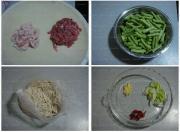 所需材料:猪肉(肥瘦都要)、豆角、面条(或买成品或自己擀)、葱、姜、红干辣椒。把它们收拾成如图所示的形状: