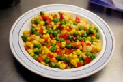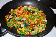炒锅放入半汤匙橄榄油烧热,放入玉米、青豆和菜椒大火先炒半分钟。