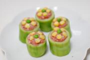 材料:大黄瓜、肉馅、葱姜末、玉米,甜青豆、胡萝卜、鸡蛋清。