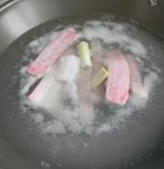 肉洗净,锅里加水放肉,大葱,姜片,料酒一起煮10分钟 。