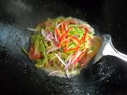 倒入青红椒、洋葱炒至断生,调好味即可。