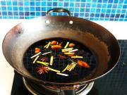 锅中放适量的五香油油,放入郫县豆瓣炒香。加入葱段、蒜末、姜片、干辣椒,5克花椒、炒香。