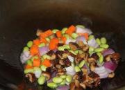 热后,除了虾仁,其余四样都倒入锅内翻炒。