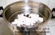 先来蒸几个糯米枣~ 上面放上冰糖,口感会很甜,颜色也很好看,也可以再放一些枸杞。寝室条件有限,顺便把蟹棒也给蒸熟了。