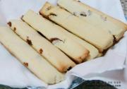 大约烤12~15分钟,见酥条儿呈微微发黄色便可取出,取出晾凉后再出盘。因为里面有提子,假如热的时候出盘提子多的部位容易断裂。