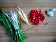 小葱切两段后结成结,姜切细丝,尖椒切圈,大蒜拍开。