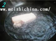 将猪腿肉洗净,锅中放入适量水和姜片、葱段、水开后放入肉煮至刚熟(约7分钟、用筷子能戳透肉)。