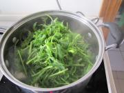 2、茼蒿放入后,再次烧开,要大火,时间短,汤开后就要揭开锅盖,否则茼蒿就黄了,这就是所谓的汆。