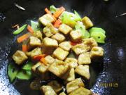 另起锅放油入葱姜蒜爆香,加豆腐丁翻炒。