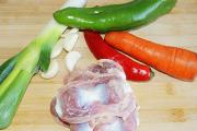 材料:童子鸡一只,土豆2个,胡萝卜半根,青椒一个,干木耳6朵花生米100克,葱姜蒜适量。