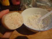 将已经泡好的糯米装进藕的洞中,可以用筷子,比较好弄,随机塞进一些葡萄干。