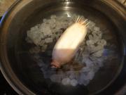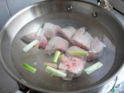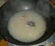 锅里放油烧热后,放进姜片爆香,然后把鱼头放进略煎,加点料酒,再注入清水,放进葱白,煮15-20分钟,等鱼汤变白后,去掉葱白,汤盛起备用。
