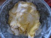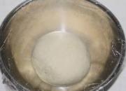 将上面的水缓缓倒入面粉盆中,一边倒一边用筷子搅拌,成絮状后,揉成面团,盖上保鲜膜发酵,等约是原体积2倍大时就可以了(用手指按下去,不会反弹,里面层蜂窝组织状)。