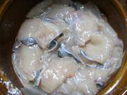 将鱼肉鱼皮朝下,斜片成厚约0.5厘米的鱼片,鱼头骨剁成两半,金针菇100克。